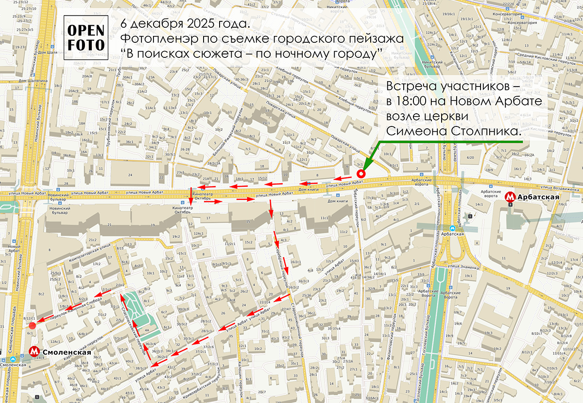 Место встречи: возле церкви Симеона Столпника, рядом с домом №6 на Новом Арбате (м. «Арбатская»).